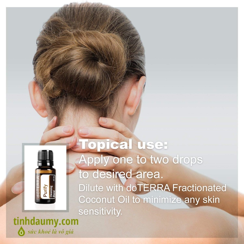 - Dùng ngoài da: xoa 1-2 giọt tinh dầu Tinh khiết Purify vào vùng da bạn muốn. Pha loãng với dầu dẫn để giảm thiểu bất kỳ sự nhạy cảm da. Xem các biện pháp phòng ngừa bổ sung dưới đây.