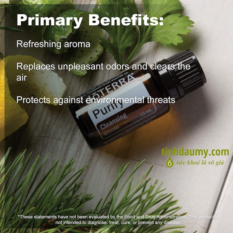 Tinh dầu Tinh khiết Purify là sự kết hợp tinh tế giữa các loại tinh dầu thanh lọc và khử mùi một cách tự nhiên và an toàn. Sự pha trộn hài hòa giữa tinh dầu linh sam và hương cam sẽ lưu lại mùi hương trong lành và thanh mát trên các bề mặt và trong không khí. Tinh dầu Tinh khiết Purify là lựa chọn ưu thích của người dùng dōTERRA, có thể loại bỏ các mùi khó chịu nhanh chóng và là chất làm sạch hiệu quả cho gia đình. Tinh dầu doterra Purify có chứa tinh dầu chanh (Lemon) và chanh á đông (Lime) vốn nôi tiếng với các đặc tính làm sạch mạnh mẽ, cùng với loài linh sam Siberia sẽ giúp thanh lọc bầu không khí và bảo vệ trước các tác hại môi trường. Ngoài ra trong thành phần còn có sả Java, tràm trà và rau mùi giúp tạo ra mùi hương độc đáo của dōTERRA và đặc tính thanh lọc không đâu sánh bằng